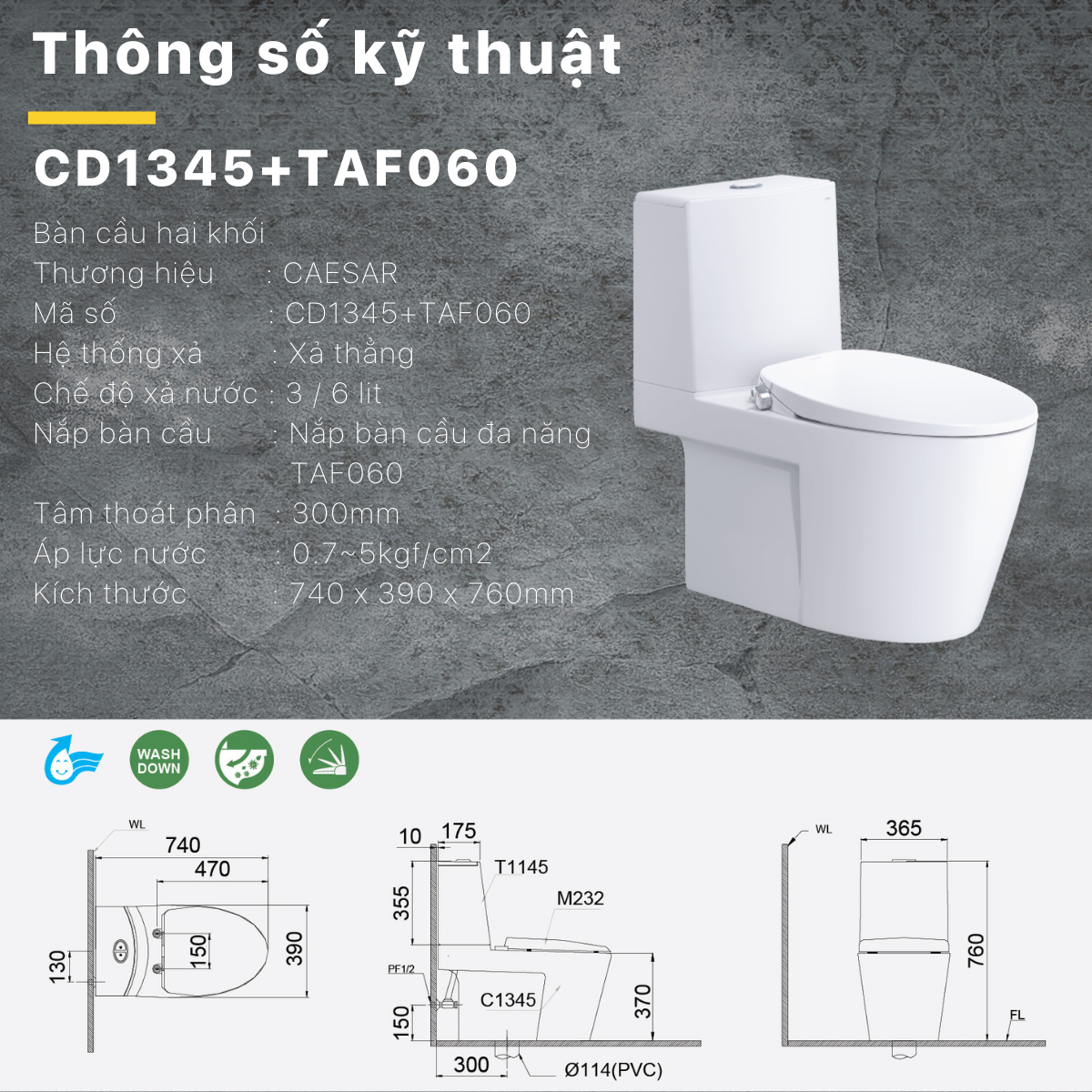 Bồn cầu Caesar CD1345 kết hợp nắp cơ TAF060